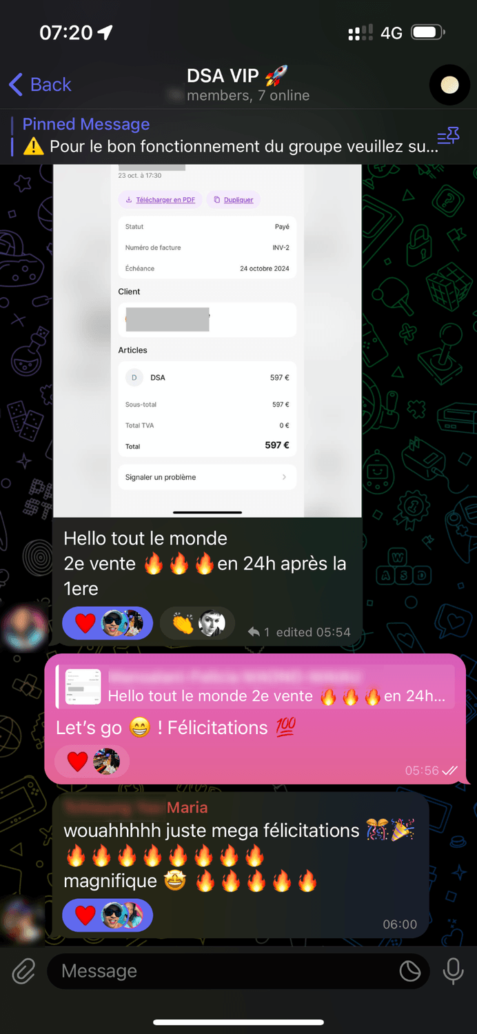 De plus j'offre un suivi où tu pourras rejoindre mon groupe d'entraide avec mes clients. Je suis également présente sur le groupe pour répondre à toutes tes questions 🚀