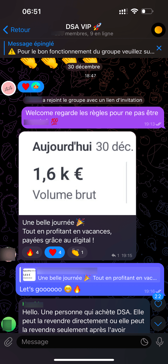 *De mon suivi dans un groupe Télegram privé afin de te permettre de faire rapidement tes premières ventes et changer le cours de ta vie.