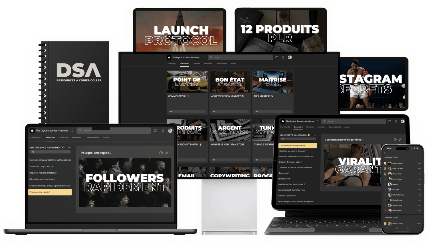 Tu reçois la formation Digital Success Academy et aussi l'accès à une communauté gratuite d'entrepreneurs du monde entier, tous niveaux d'expérience confondus, prêts à se connecter avec toi et te soutenir !